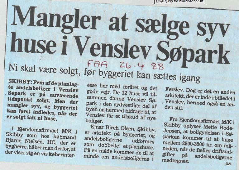 Mangler at sælge syv huse i Venslev Søpark. Artikel fra Frederiksborg Amts Avis 26 april 1988.
